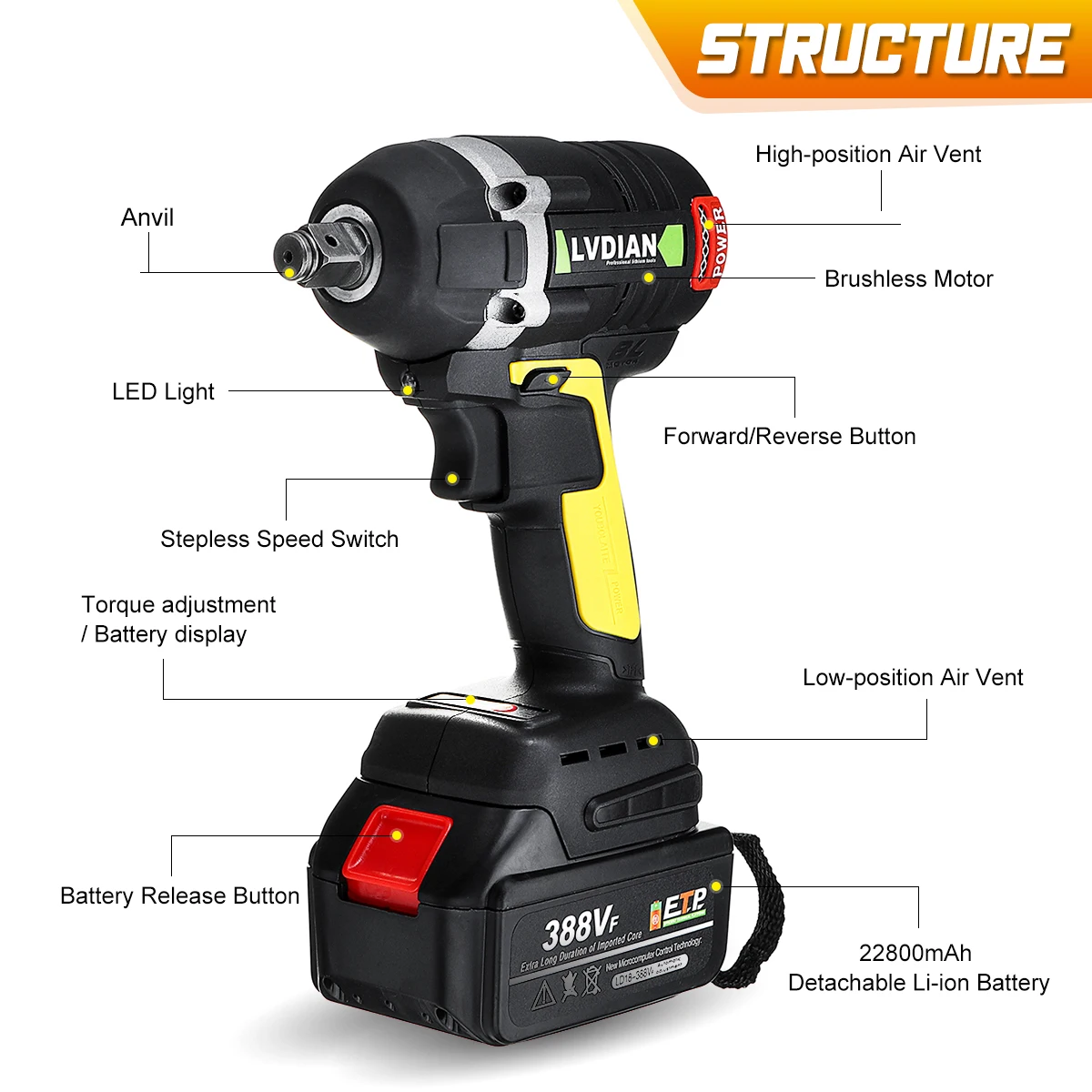 Addition Information of 388VF 630N.m Cordless Electric Brushless Wrench Rechargeable 19800mAh Li Battery Torque Guns LED li
