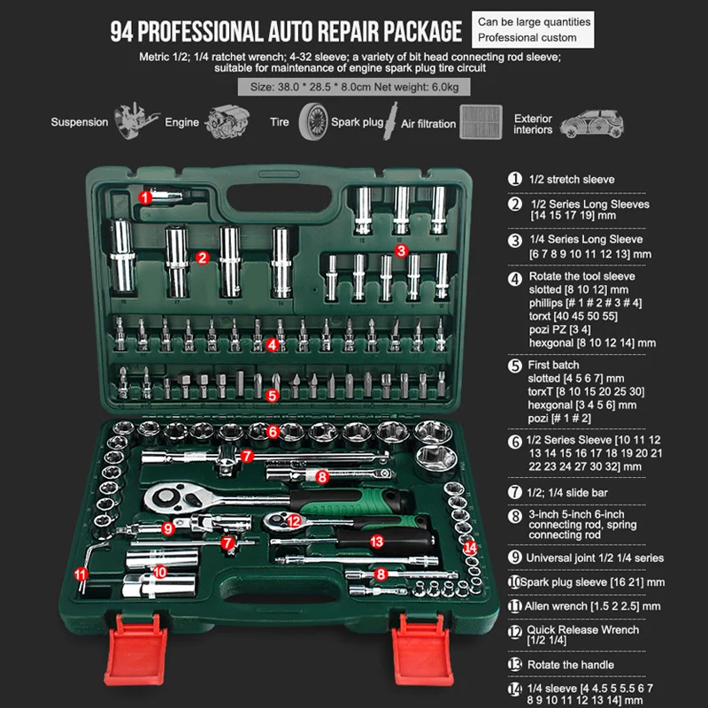 Addition Information of Motor Car Repair Tool Set 94pcs Tool Combination Torque Wrenches Ratchet Socket Spanner Mechanics T